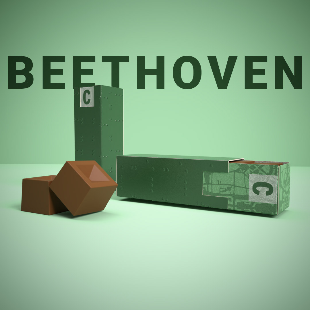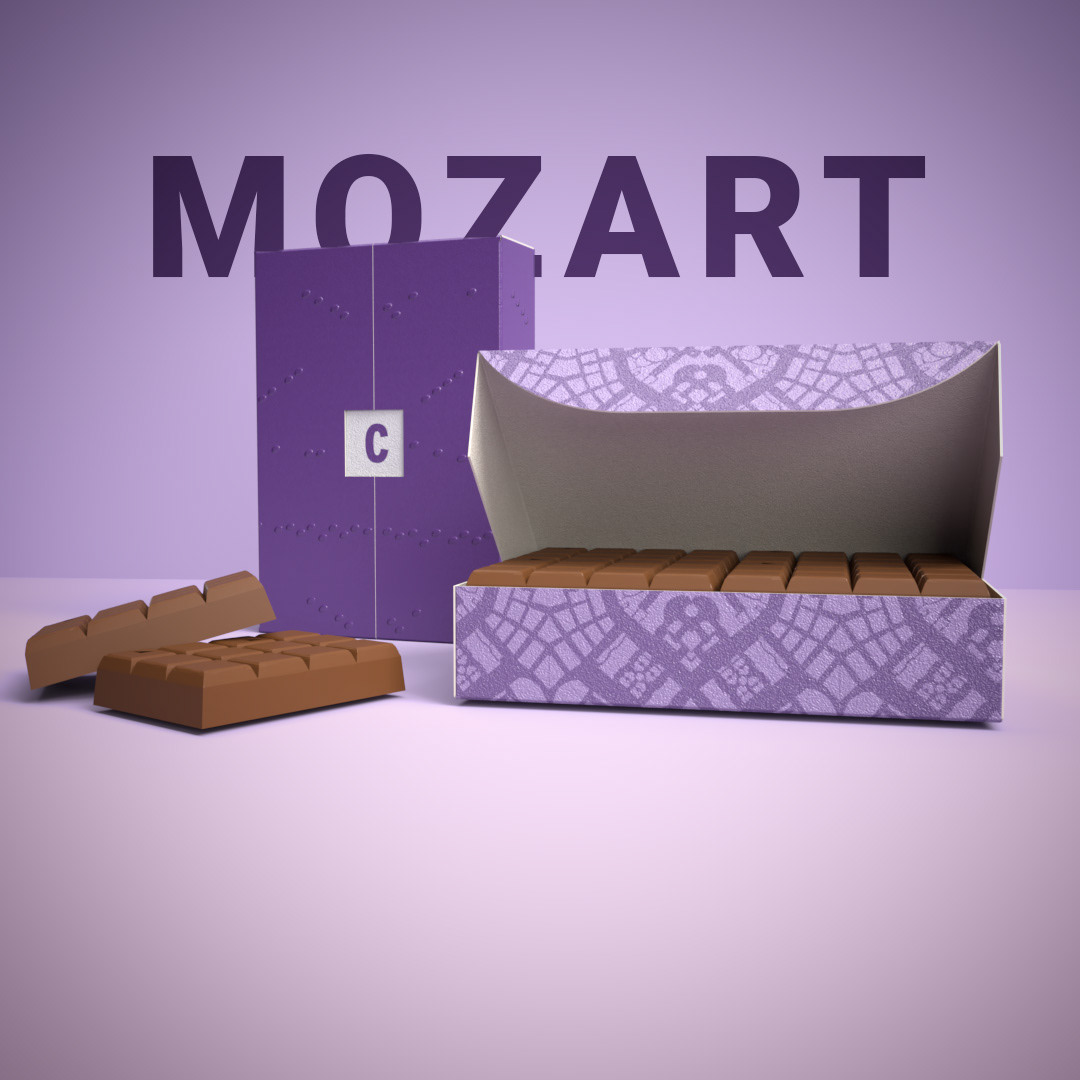 Elke verpakking vertelt een verhaal: de kleuren verwijzen naar de stad die een belangrijke rol speelde in het leven van de componist, de binnenzijde onthult het stratenplan van een betekenisvolle plek, en de bovenkant schittert met noten uit een beroemde partituur. Zo smelten muziek, cultuur en smaak samen tot een unieke beleving.