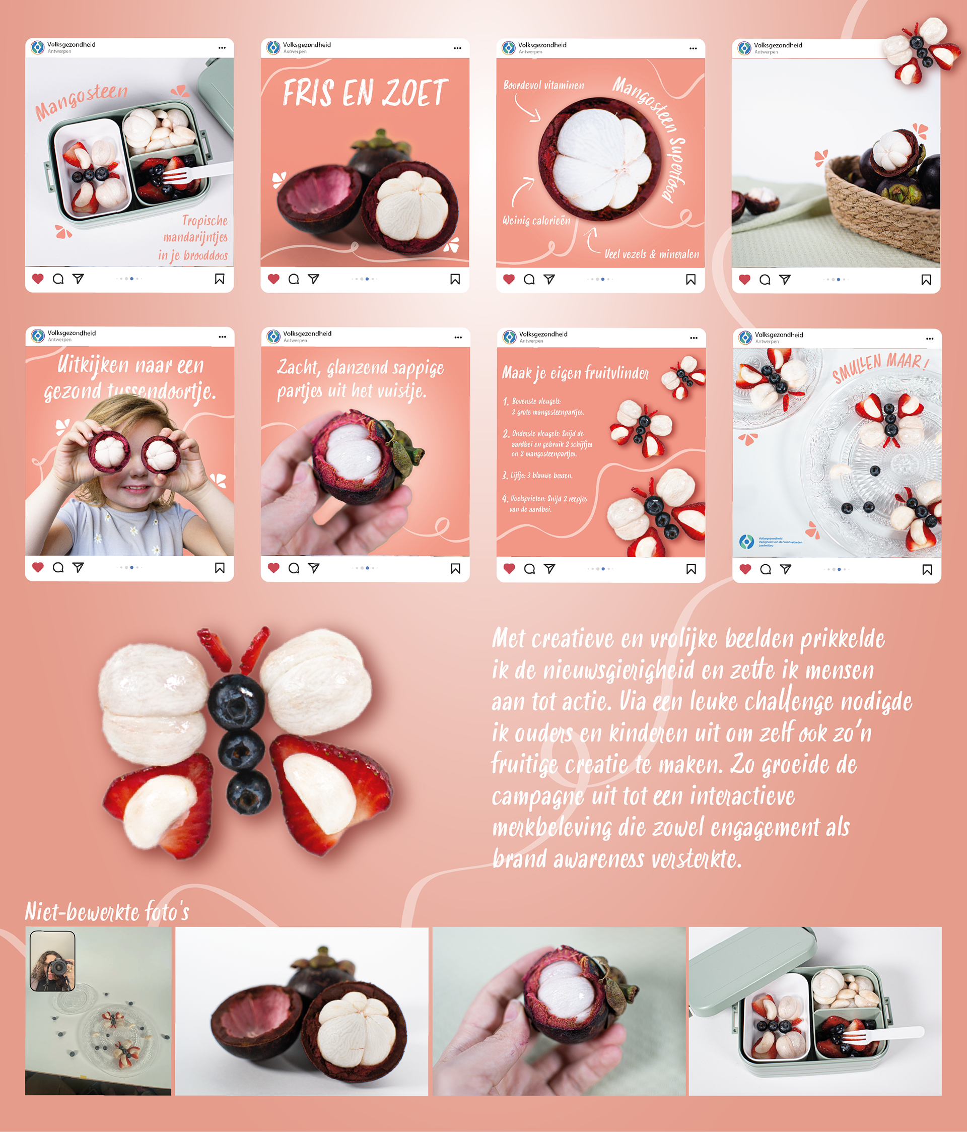 Voor deze Instagramcampagne bedacht en realiseerde ik het volledige concept: van idee tot fotografie. Om een exotische vrucht dichter bij het Vlaamse publiek te brengen, koos ik bewust voor een speelse link met mandarijntjes. Dat maakt het herkenbaar en meteen toegankelijk.